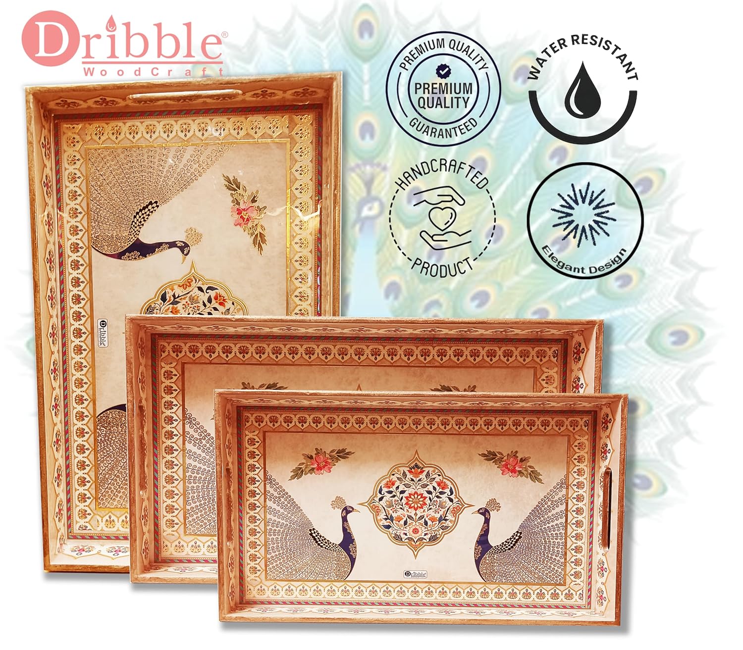 Click to see full view Dribble Premium MDF Wood Serving Tray Set of 3 | Gold Engraved Decorative Trays | Waterproof Enamel Coated | Peacock Plazoo Design | Rectangular | 16x10,14x8 &12x6 Inch | for Kitchen, Dining & Gifting